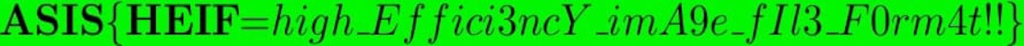 Apart from asisctffinal, what clearly stands out is: hvc1HEVC Image. Googling HEVC Image points us at a new image file format: HEIF. Moreover, ifhe in the challenge name is an anagram of HEIF. This gives us some idea about kind of file we’re dealing with. Still, we’re unable to open it. To resolve this issue we need to find a valid HEIF file to compare with ours and look for differences between them. We’ve chosen this example.