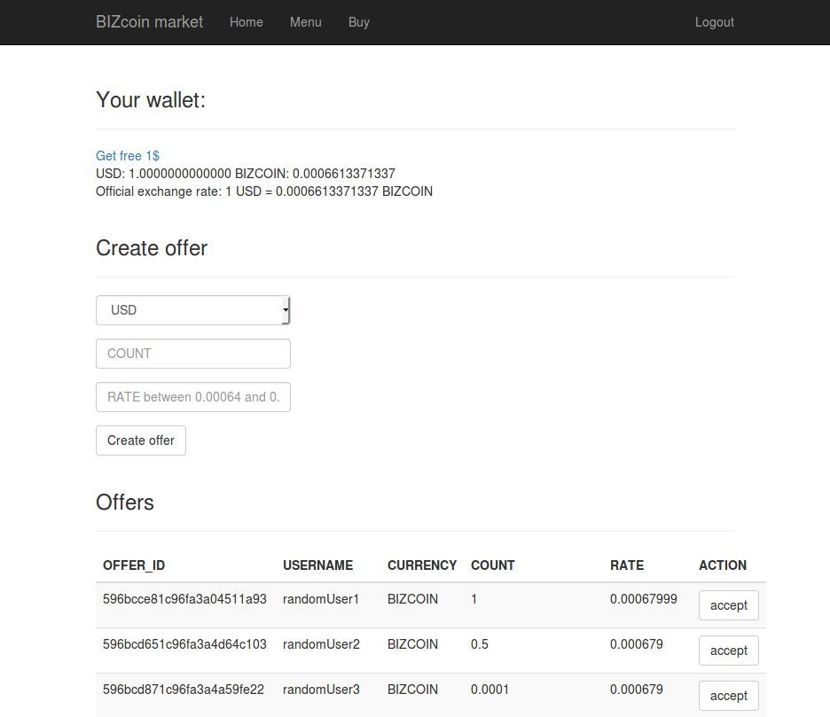 Rate is just the price of 1$ in BIZcoins. - Accept an offer (if we have enough resources to do it). The creator of the offer has to accept it too, but it’s just a technical issue, so let’s pass over it.