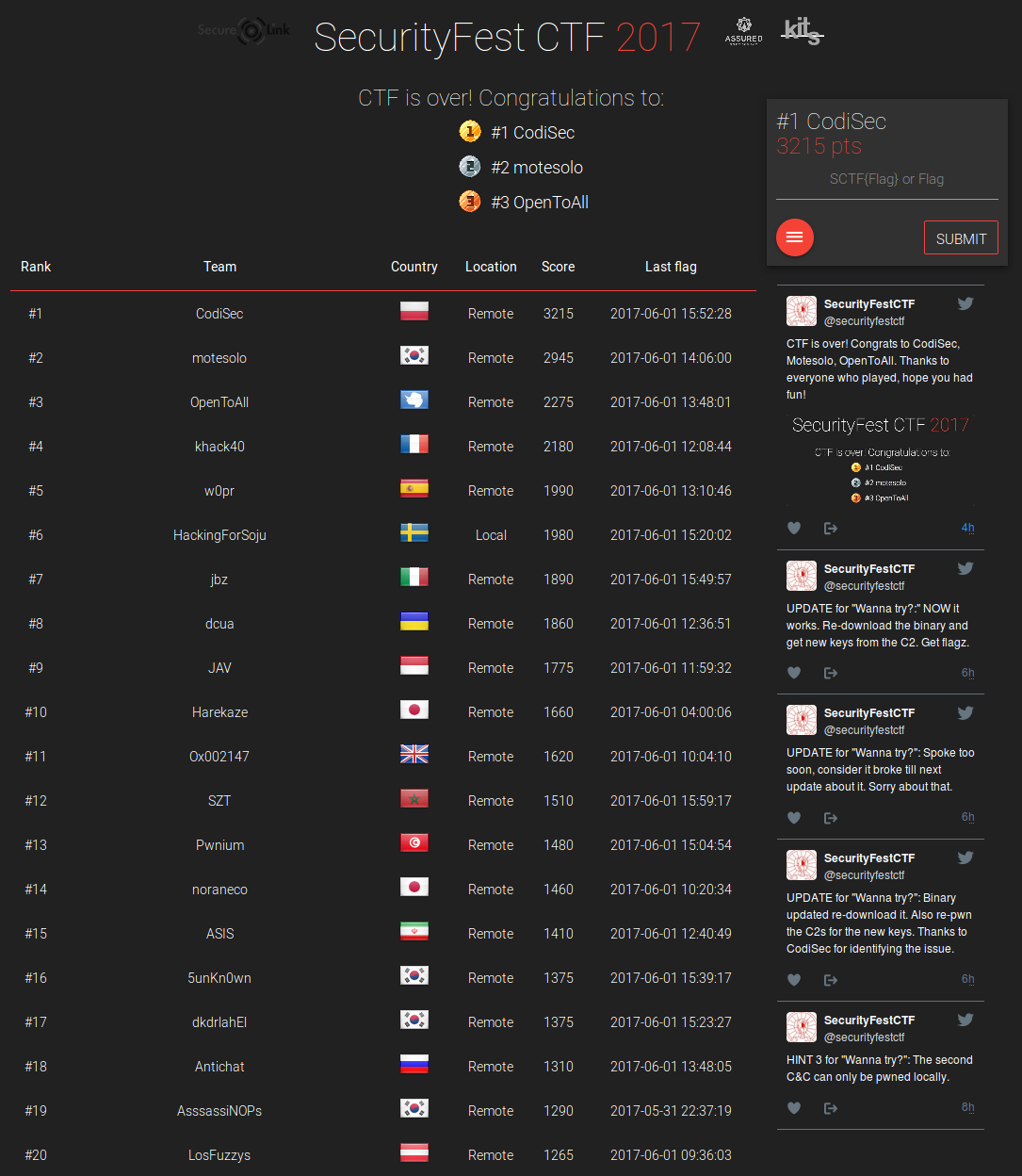 CodiSec CTF team captured the most flags — and the title — at recent CTF held during SecurityFest conference in Göteborg, Sweden. CodiSec beat out 200 global competitors, going down to the wire against a Korean team they overcame only in the last 30 minutes of play.